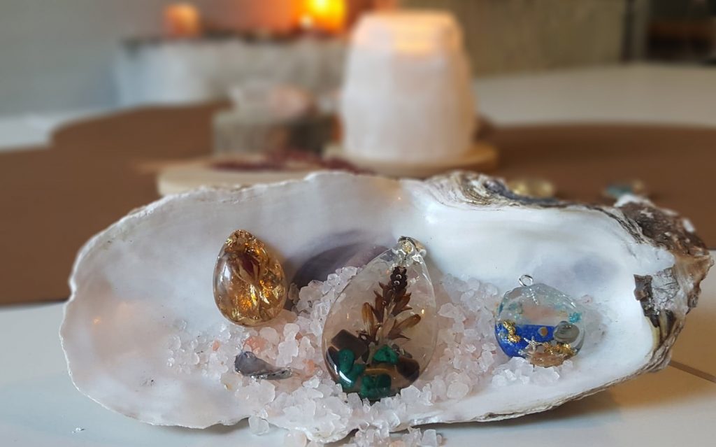 Iedereen krijgt een pendelvorm om te vullen met krachtige steentjes en mineralen, prachtigs uit de natuur, en mooie versierseltjes. Deze worden in hars gegoten en als ze uitgehard zijn door mij afgewerkt en naar u opgestuurd via de post.